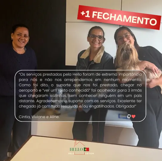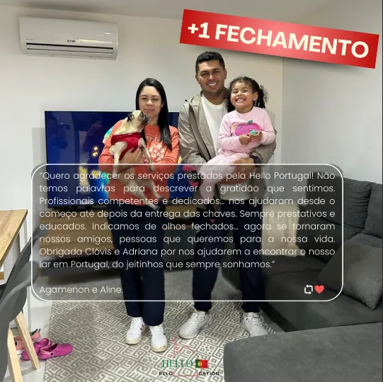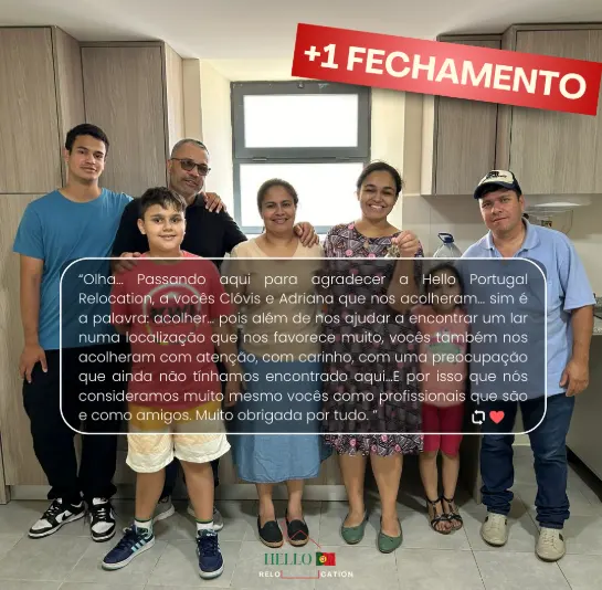 "Gostaríamos de agradecer pelo excelente trabalho da Hello Portugal, Clóvis e Adriana, desde o início foram super prestativos, atenciosos e cuidaram de cada detalhe do processo. A dedicação e o profissionalismo fizeram toda a diferença e transformaram algo que poderia ser complicado numa experiência tranquila e positiva. A ajuda na procura por um lar foi essencial para que nos sentíssemos acolhidos e seguros nessa nova fase. Recomendamos de olhos fechados e estamos muito felizes com todo o apoio que recebemos. Agradecemos por tornarem essa etapa tão especial e acolhedora!"