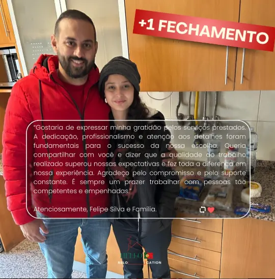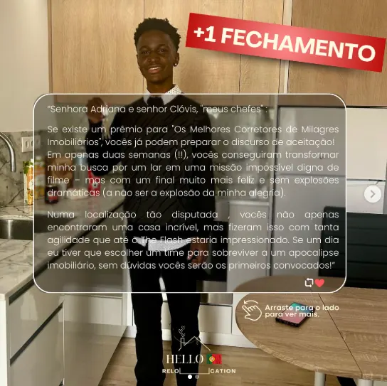 "Mais uma vez, gostaria de agradecer, Clóvis e Adriana, da @helloportugalerelocation, pelo trabalho incrível realizado na busca do nosso novo apartamento. O profissionalismo e o atendimento personalizado se destacaram desde a contratação do serviço. Posteriormente, esclareceram todas as nossas dúvidas, sempre com muita agilidade e cordialidade. A visita ao imóvel foi excepcional, pudemos observar todos os detalhes do apartamento e do entorno, o que nos proporcionou uma boa percepção do local!"